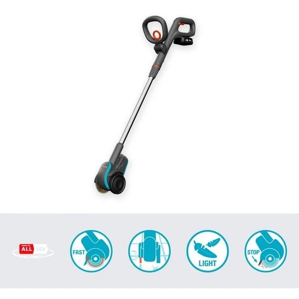 Die GARDENA Akku-Fugenbürste EasyWeed 1800/18V P4A reinigt präzise und ganz ohne den Einsatz von Chemikalien, einfach und mühelos auf Knopfdruck. Der unerwünschte Wildwuchs ist oft extrem hartnäckig und manuell schwer zu entfernen. Die Fugen per Hand reinigen ist ein mühsames und zeitaufwendiges Unterfangen. Mit dem handlichen und durchzugsstarken EasyWeed 1800/18V P4A säubert man die Fugen innerhalb kürzester Zeit, ohne mühevolle Handarbeit. Verschmutzungen und Ablagerungen werden einfach aus der Fuge herausgebürstet. Das leichte Gerät hat einen höhenverstellbaren Schaft, so dass es einfach an die Körpergröße angepasst werden kann. Der ergonomisch geformte Griff und der zusätzliche Frontgriff machen die Handhabung besonders angenehm. Durch das schlanke Design ist genaues und sauberes Arbeiten besonders einfach, denn man hat Fuge und Bürste jederzeit im Blick. Eine Markierungslinie am Gehäuse vereinfacht die präzise Positionierung der Bürste zusätzlich. Das Führungsrad erleichtert die Handhabung und entlastet den Benutzer. Der Schmutzfänger und die Schutzklappe sorgen für sauberes Arbeiten. Die Fugenbürste Stahldraht ist für unempfindliche Oberflächen und schmale Fugen geeignet. Für kratzempfindliche Oberflächen ist der Einsatz der Fugenbürste Nylon (separat erhältlich) mit weicheren Borsten empfehlenswert. Besonders praktisch ist auch die individuelle Geschwindigkeitsregulierung der Akku-Fugenbürste EasyWeed 1800. So kann man mit weniger Umdrehungen der Bürste empfindliche Stellen sanft reinigen. Ist mehr Power gefragt, geht es mit bis zu 1.800 U/min ans Werk. Die LED-Anzeige im Handgriff zeigt dabei den verbleibenden Ladezustand an. Die benötigten 18 Volt System-Akkus der Power for All Alliance basieren auf der Technologie von Bosch. Sie passen auch in eine Vielzahl anderer Gartengeräte von GARDENA, können aber auch markenübergreifend mit zahlreichen weiteren Produkten anderer Hersteller aus der Allianz verwendet werden.Art.-Nr.: 100025202