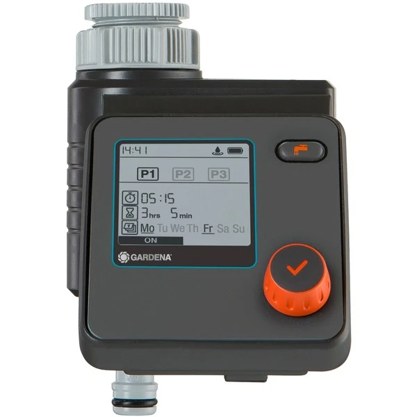 Die GARDENA Bewässerungssteuerung Select entlastet bei der Gartenbewässerung, z.B. beim Betrieb von Regnern, dem GARDENA Sprinklersystem, auch mit dem GARDENA Micro-Drip-System. Der Bewässerungscomputer wird direkt an den Wasserhahn angeschlossen und steuert die Bewässerung zuverlässig zur eingestellten Zeit und Dauer. Damit muss man weder im Alltag noch während des Urlaubs ans Gießen denken, weil alles automatisch nach den eigenen Wünschen läuft. Für die Bewässerung lassen sich drei unterschiedliche und völlig voneinander unabhängige Zeitpläne erstellen. Einstellbar sind Start, Dauer und Wochentage der Bewässerung, so lassen sich ganz flexible Pläne nach dem persönlichen Geschmack einstellen. Das Bedienteil lässt sich abnehmen, um es bequem zu programmieren. Auf dem übersichtlichen LCD-Display werden die ausgewählten Einstellungen angezeigt. Das Programmieren ist selbsterklärend und geht ganz leicht. Danach steckt man das Bedienteil wieder an. Hat man einmal die Vorgaben eingestellt, steuert der Computer das Gießen automatisch nach den eigenen Wünschen. Die Funktion „Sofort Bewässern“ ermöglicht eine manuelle Bewässerung oder das Befüllen eines Eimers ohne Abschrauben der Bewässerungssteuerung und stoppt automatisch wieder nach vorgegebener Dauer. Außerdem ist die Bewässerungssteuerung Select sensorfähig, ein angeschlossener Sensor (separat erhältlich) misst die Bodenfeuchte und unterbricht den Zeitplan, wenn es zum Gießen zu nass ist. Mit einer 9 V Alkaline Batterie (nicht im Lieferumfang enthalten) funktioniert die Bewässerungssteuerung Select zuverlässig ca. ein Jahr lang.Art.-Nr.: 1491791