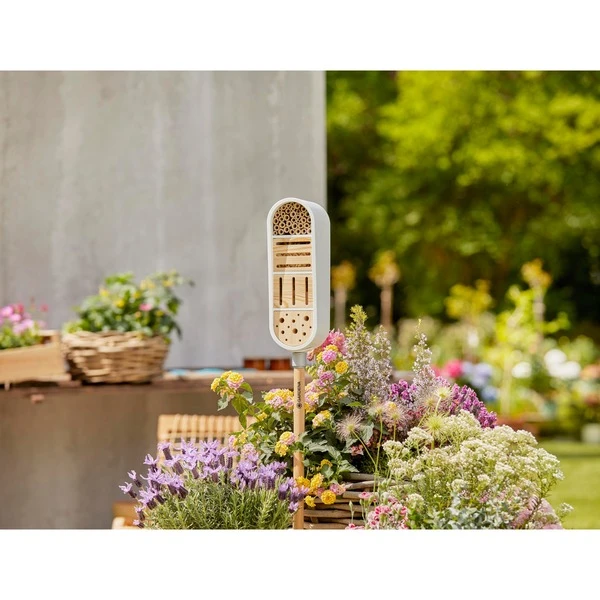 Das GARDENA ClickUp! Insektenhotel bietet eine Nist- und Überwinterungshilfe für nützliche Insekten, es bietet vier artgerechte Lebensräume für unterschiedliche Insekten wie Wildbienen, Schmetterlinge und Marienkäfer. Viele Insekten finden in ihrem natürlichen Lebensraum keine zuverlässige Nist- und Überwinterungsstelle mehr. Das ClickUp! Insektenhotel im Garten ist eine sichere und ästhetische Zuflucht und ein geschütztes Zuhause für die heimische Artenvielfalt. Das Insektenhotel ist mit einer Füllung aus FSC-zertifiziertem Holz versehen, der Rahmen um die einzelnen Bereiche bietet Schutz vor der Witterung. Das GARDENA ClickUp! Insektenhotel ist zur Verwendung mit dem GARDENA ClickUp! Stiel vorgesehen, auf dem es sich mit einem Klick wackelfrei befestigen lässt. Es ist nachhaltig lackiert und frostsicher.Art.-Nr.: 1687404