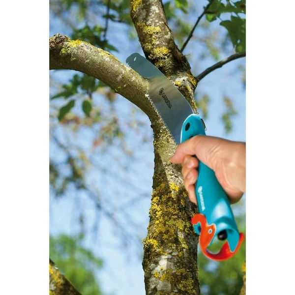 Die GARDENA combisystem-Gartensäge 300 PP kann auf Wunsch mit einem teleskopierbaren combisystem-Stiel kombiniert werden, wodurch Arbeiten flexibel bewältigt werden können: Egal ob ganz normal als Handsäge bei einfach erreichbaren Ästen oder in bis zu fünf Metern Höhe. Dabei wird der combisystem-Stiel einfach mit dem Sicherheitsverschluss fixiert und ermöglicht so einen festen und sicheren Halt. Das Sägeblatt mit 325 mm Länge und Präzisionszahnung sorgt für einen sicheren Schnitt. Gegen Rost durch die Spezial-Beschichtung geschützt hat es impulsgehärtete Zahnspitzen mit Zwei-Seiten-Schliff. Ein Stopper am Griffende sorgt für Abrutschsicherheit selbst bei ziehenden Bewegungen. Zur Aufbewahrung kann das Sägeblatt der GARDENA combisystem-Gartensäge 300 PP mit einem Schneidenschutz geschützt und die Säge so sicher an einer Öse aufgehängt werden.Art.-Nr.: 1213973