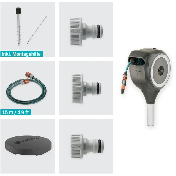 | Zubehör | vorhanden | Original GARDENA Systemteile und Spritze, flexibler Anschlussschlauch, Bodenhülse, Montagehilfe | |