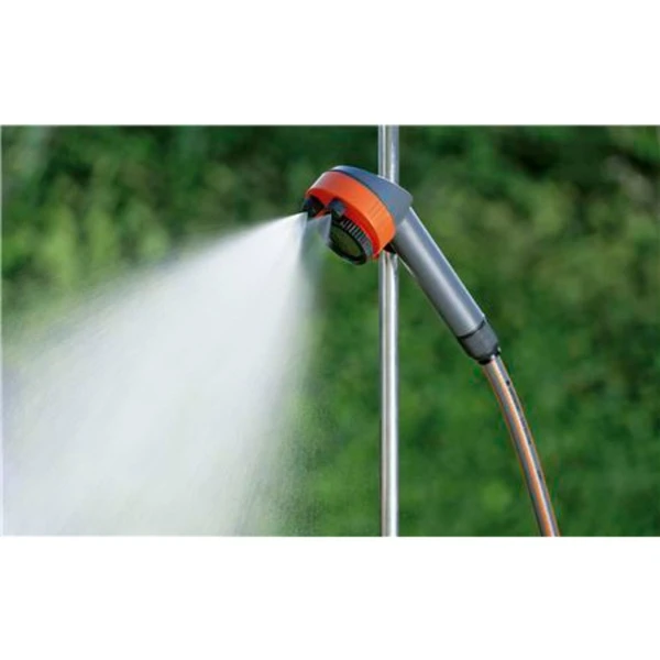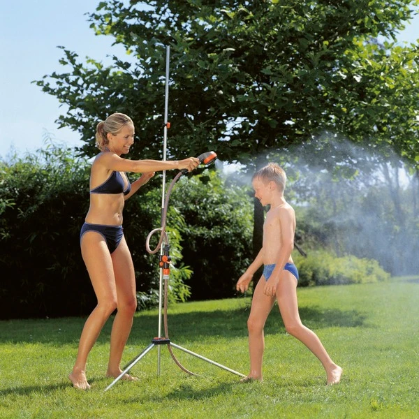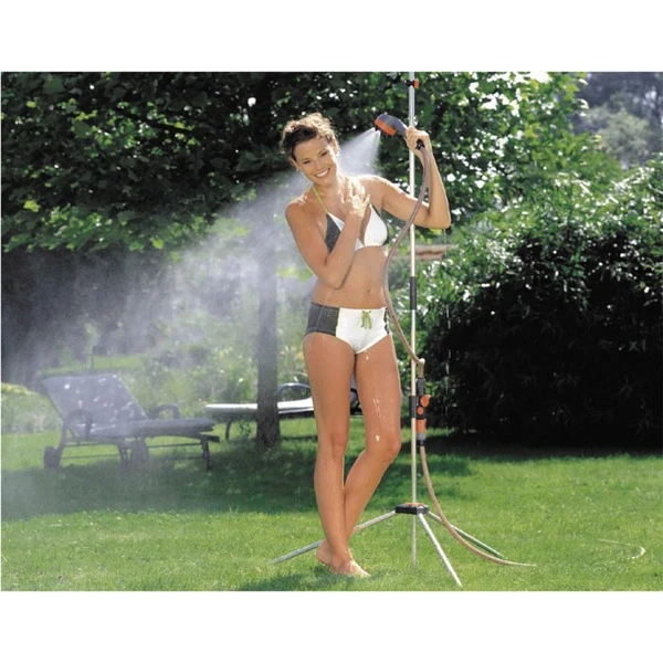 Die GARDENA Gartendusche trio 960-20 sorgt für Spaß beim Duschen im Freien. Das Dreibein-Stativ ermöglicht es, die Dusche überall leicht aufzustellen. Außerdem gibt der flexible und abnehmbare Brausekopf, der mit einem 1,3 Meter langen Schlauch verbunden ist, mehr Freiraum für das Gartenduschen. Es steht ein weicher und breit gefächerter Brausestrahl oder der fein einstellbarer Sprühnebel für eine ganz besondere Erfrischung zur Auswahl. Die GARDENA Gartendusche trio ist stufenlos höhenverstellbar und der Druckknopf bietet die ideale Fixierung der Brause für jede Körpergröße. Das Regulier- und Absperrventil erlaubt eine optimale Dosierung der Wassermenge.Art.-Nr.: 1213333