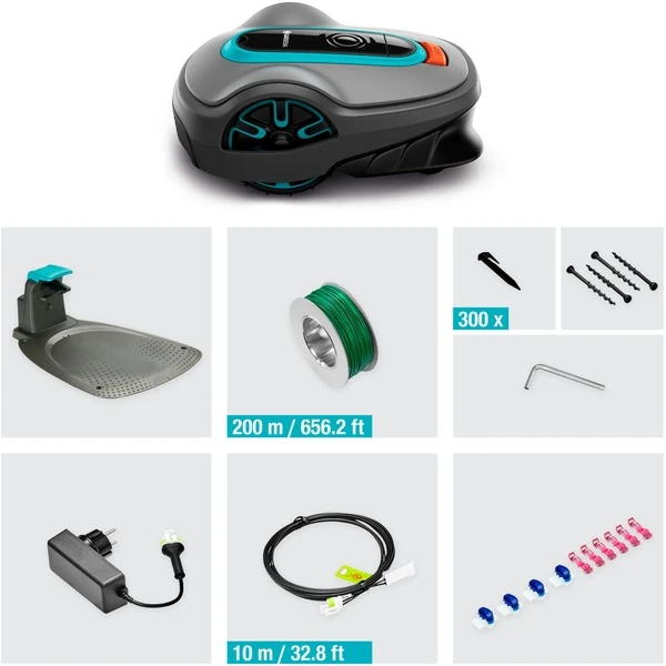 | Zubehör | vorhanden | Begrenzungskabel 200m, Haken 300 Stück, 4 Verbinder, 5 Anschlussklemmen | |