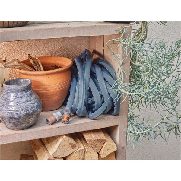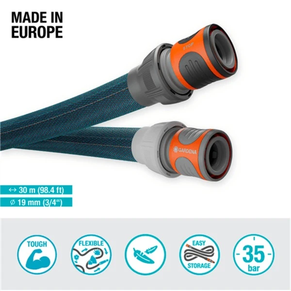 Der 3/4″ Textilschlauch Liano Xtreme von GARDENA mit 30 Metern Länge eignet sich ideal für lange, intensive Bewässerungen in großen Gärten sowie für anspruchsvolles Gelände. Der Durchmesser von 19mm erlaubt einen hohen Wasserdurchfluss und ist ideal für den schnellen Transport einer großen Menge Wasser. Der Liano Xtreme ist beispielswiese für die Versorgung von großen Sprinklern oder Pumpen einsetzbar. Der robuste Allrounder ist dank der vormontierten Original GARDENA Systemteile Liano Schlauchverbinder und Liano Wasserstop schnell einsatzbereit. Die enorme Widerstandskraft und Flexibilität des Textilschlauches zeigt sich bei herausfordernden Umgebungen wie Pflastersteinen, Rosendornen oder entlang von Kanten und Hauswänden. Der Liano Xtreme ist schmutzabweisend und kann leicht um Hindernisse geführt werden. Der strapazierfähige Schlauch hält auch besonders extremen Situationen stand und verknickt nicht während der Arbeit. Seine ausgezeichnete Strapazierfähigkeit und Langlebigkeit resultieren aus dem sehr flexiblen PVC-Innenschlauch und der Verarbeitung des innovativen Außenschlauches aus extrem widerstandsfähigem Textilgewebe. Dabei ist er bis zu 50% leichter als herkömmliche PVC-Schläuche und dadurch auch über längere Zeiträume hinweg bequem in den Händen zu tragen. Die angenehme Haptik und die ausgezeichnete Elastizität vereinfachen die Bewegung und das Ziehen des Schlauches über den Boden deutlich, auch bleibt weniger an Hindernissen hängen. Der Liano Xtreme erleichtert außerdem das Verstauen, da er sich einfach und kompakt an den vorhandenen Stauraum anpasst. Er kann bequem ins Regal, in die Garage oder in den Keller gelegt werden, ohne sich selbst wieder aufzurollen. Er ist schadstofffrei, daher frei von Phthalaten sowie frei von Cadmium, Blei und Barium. Der in Europa hergestellte Gartenschlauch hat einen Berstdruck von 35 bar und kann dank UV- und Frostschutz ganzjährig im Freien aufbewahrt werden.Art.-Nr.: 1890213