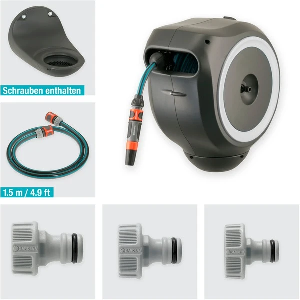| Zubehör | vorhanden | Original GARDENA Systemteile und Spritze, flexibler Anschlussschlauch, Wandhalterung, Schrauben, Dübel, Montagehilfe | |